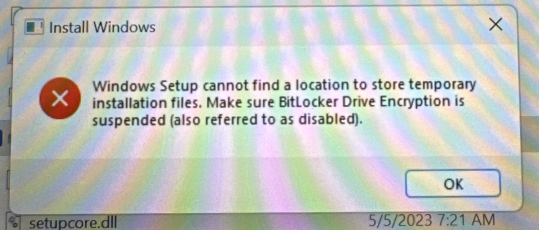 - The message "Make sure BitLocker Drive Encryption is suspended" could appear from the Windows Setup when you press Enter. Refer to our BitLocker decrypting instructions to resolve this, then retry from step 5 onwards